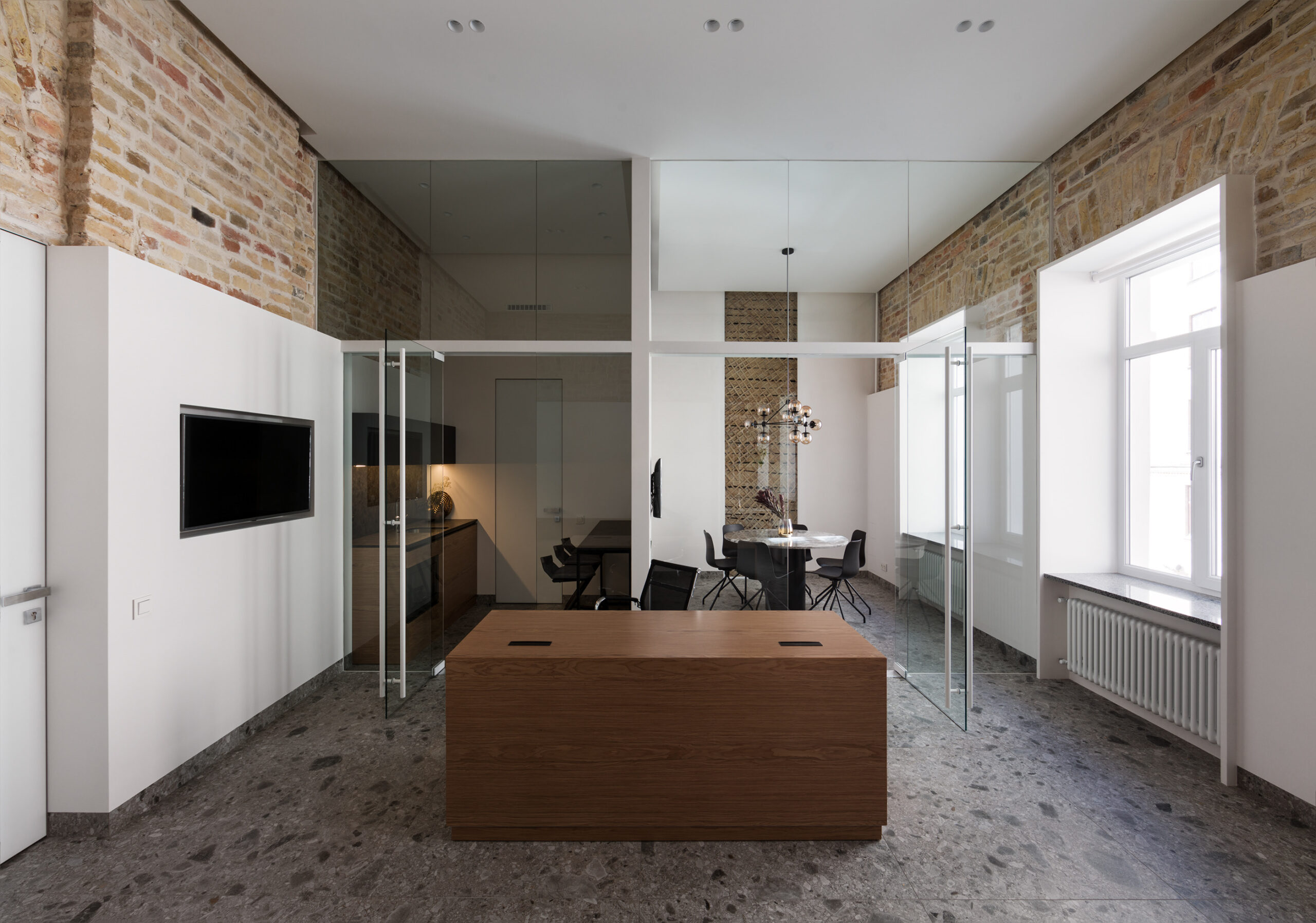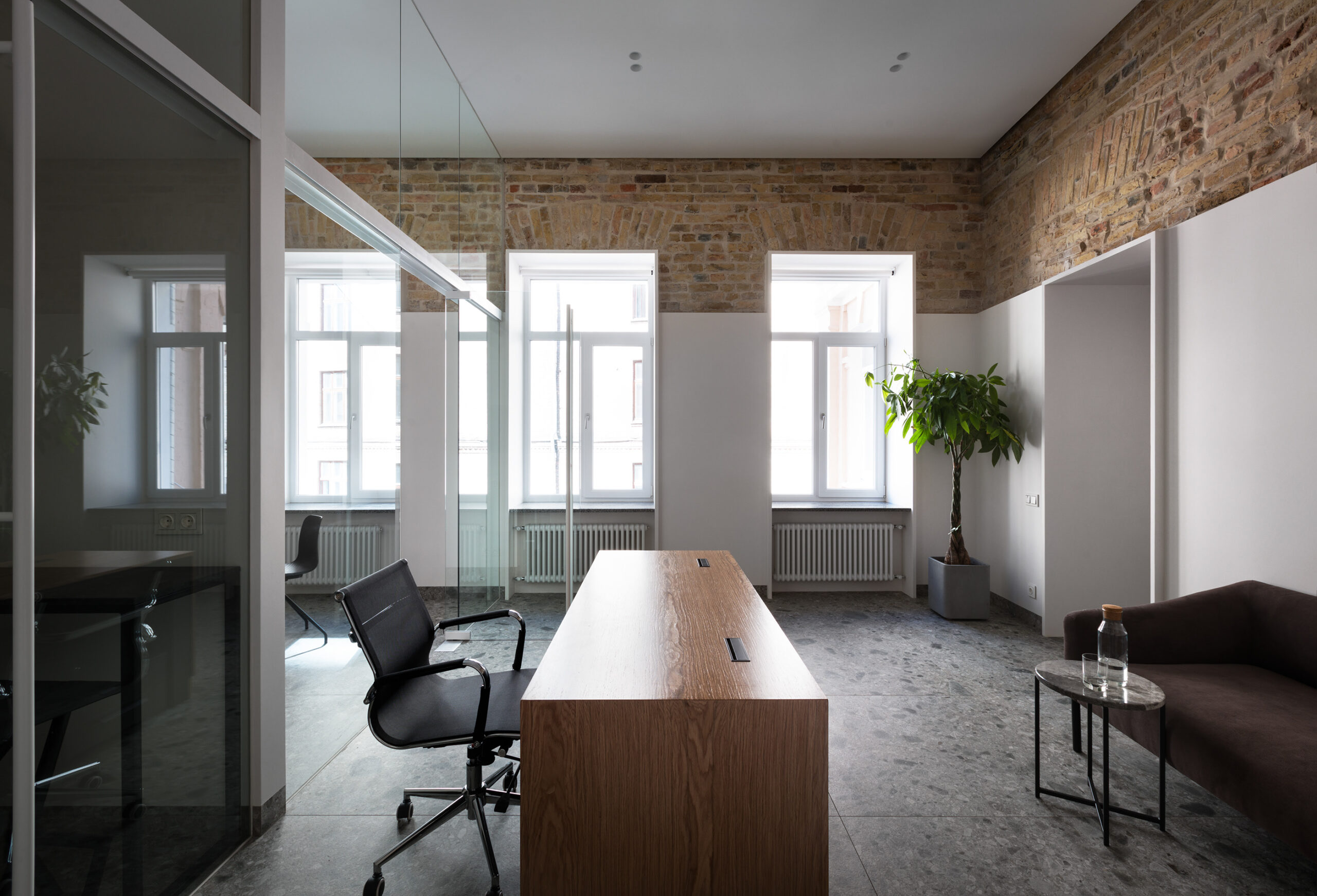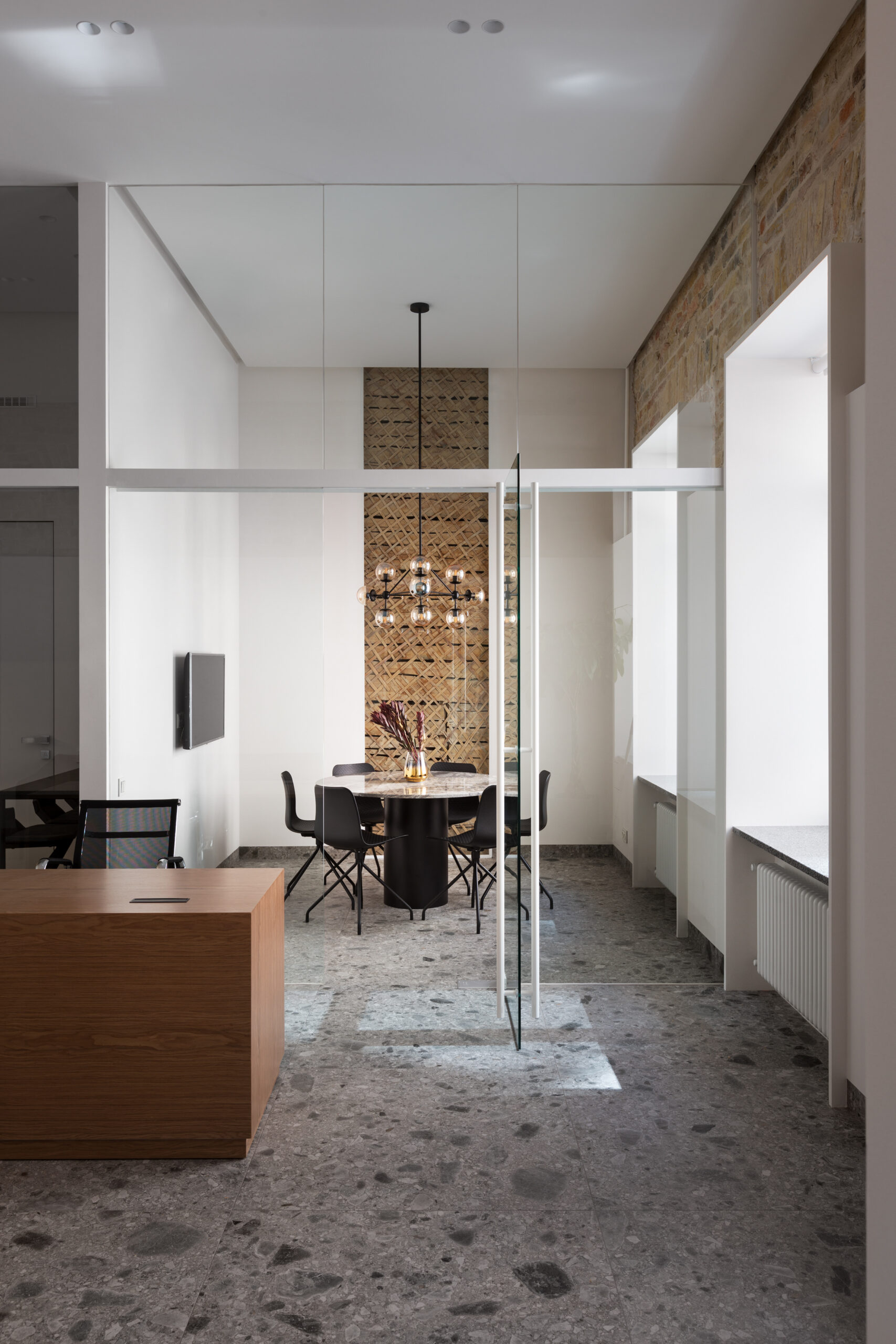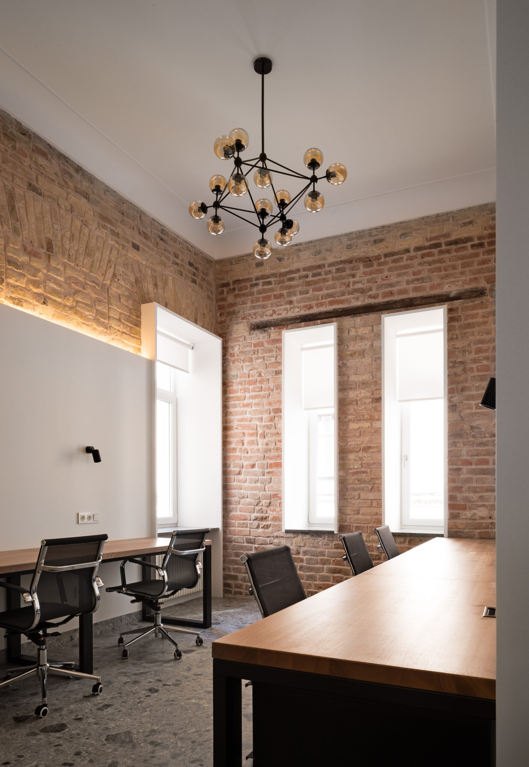 The location peculiarities serve as a milestone of the project concept. Thus the key task was to preserve the existing authentic brickwork together with other original architectural elements such as the wooden grid in the meeting room.