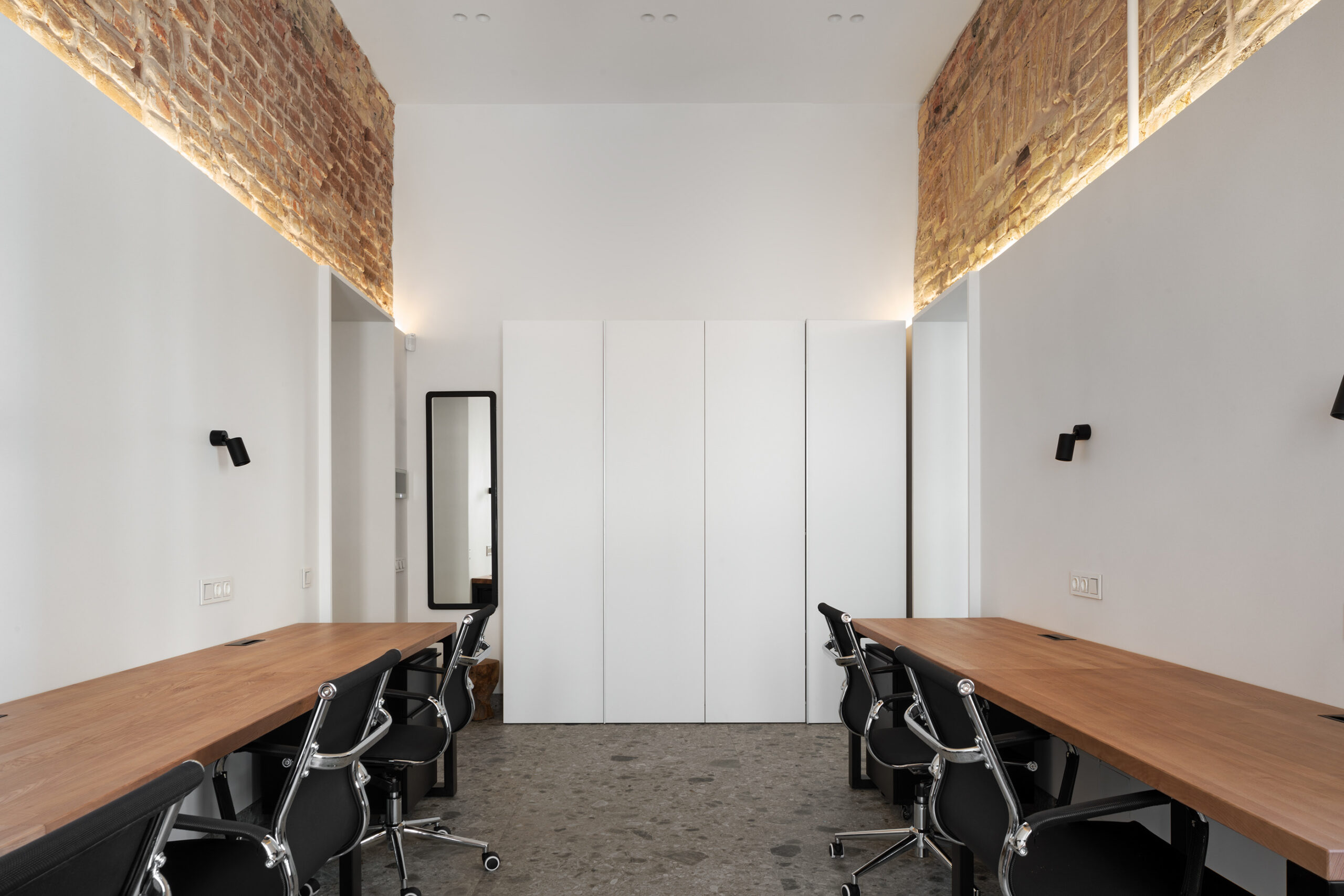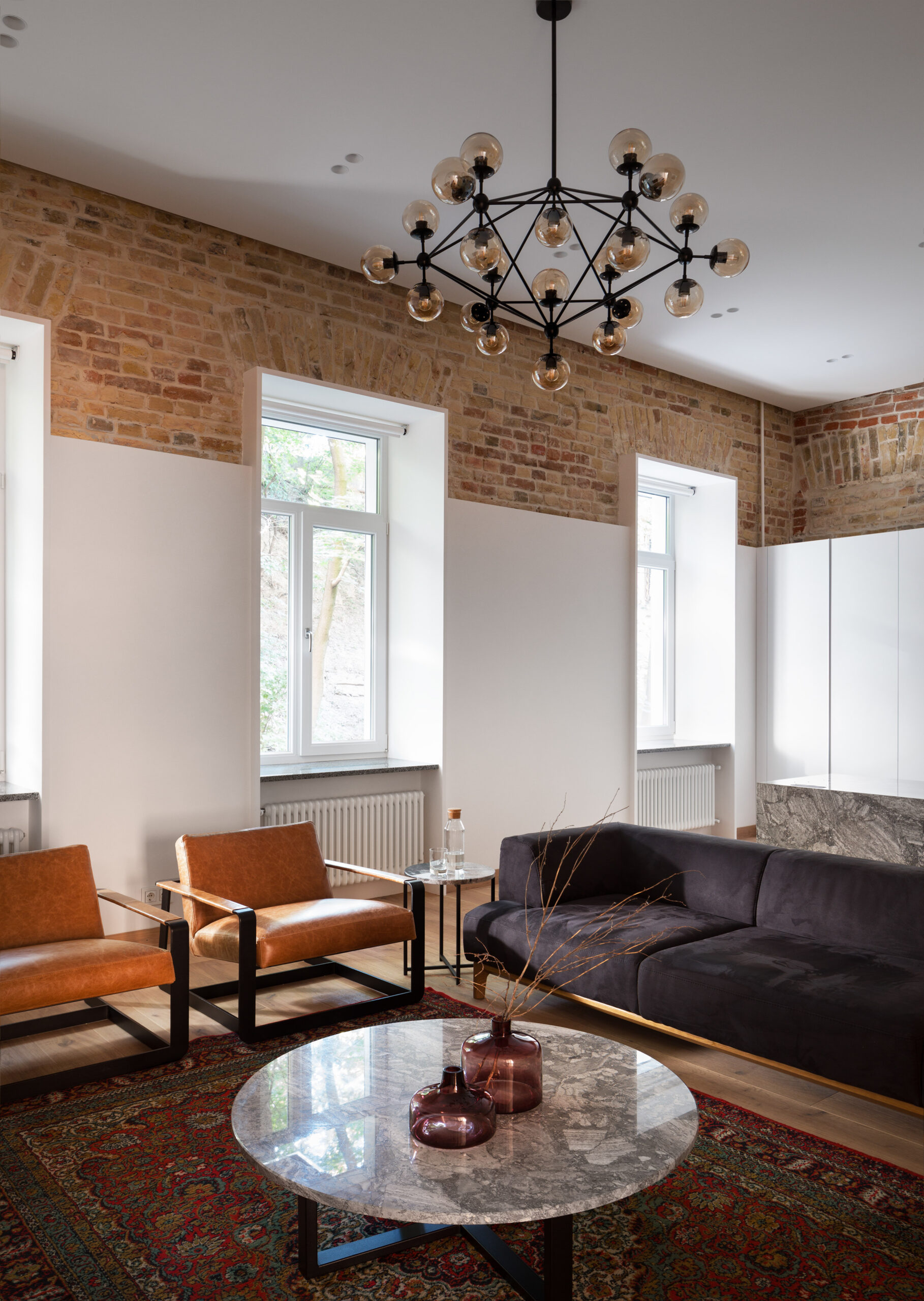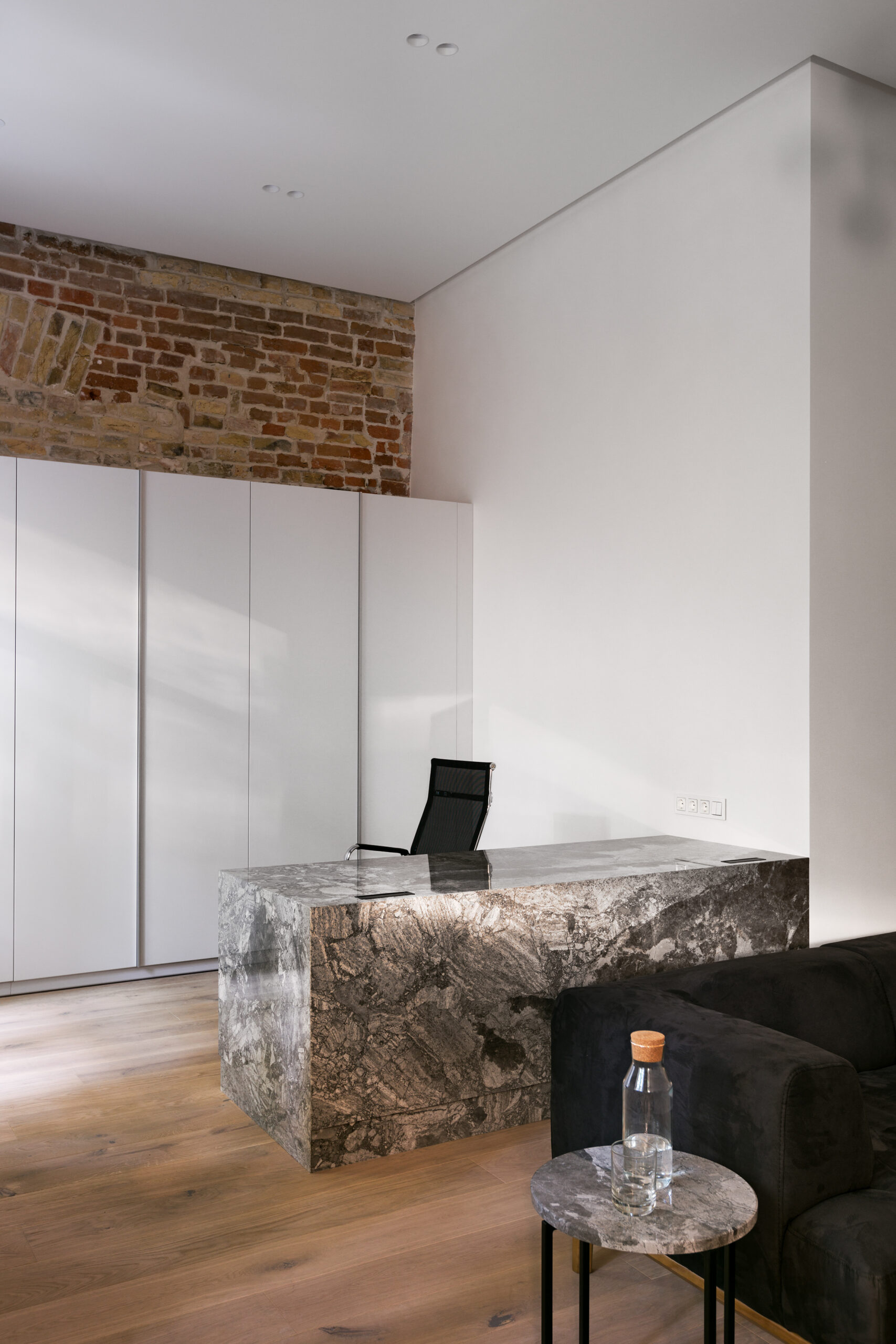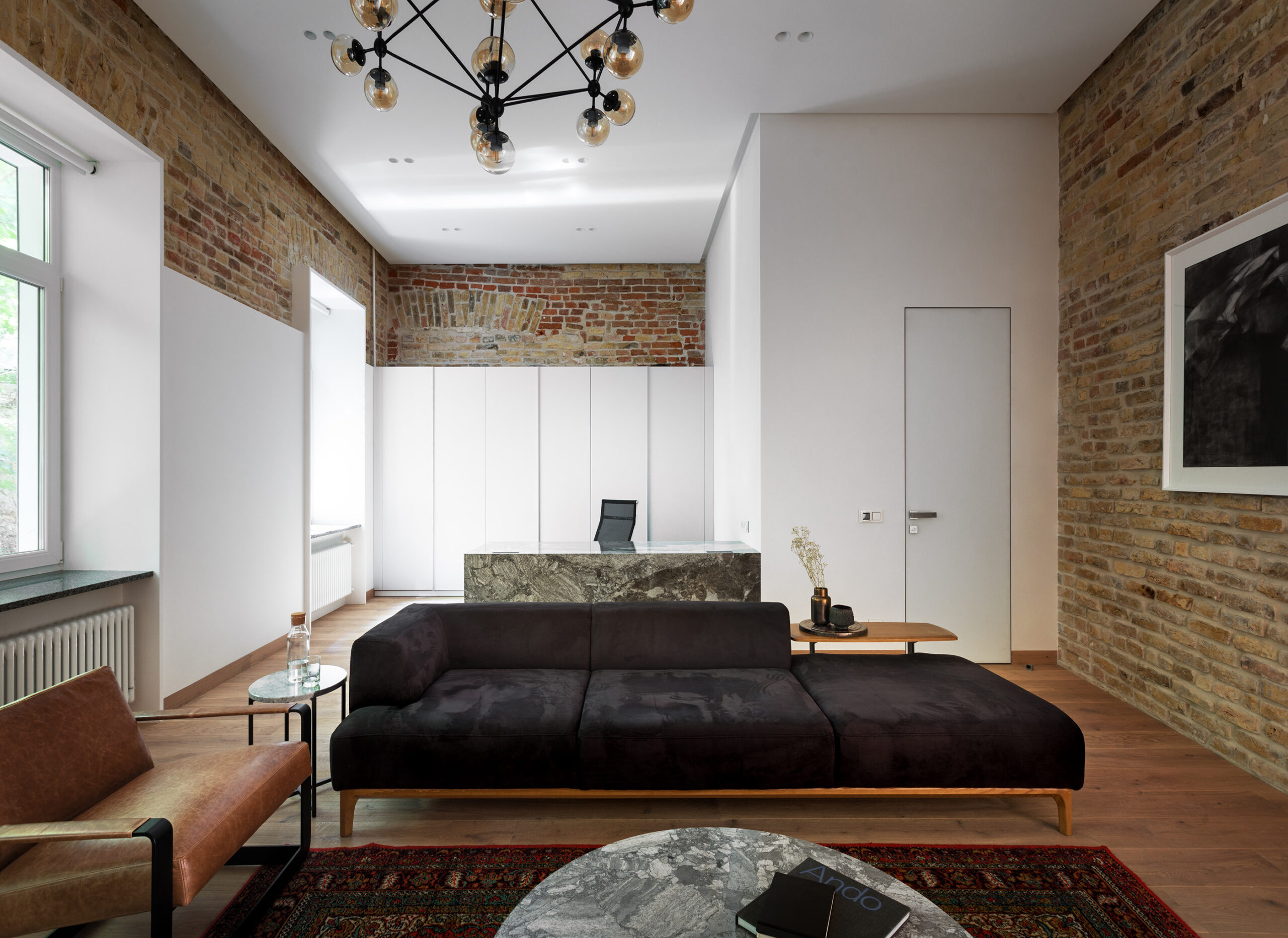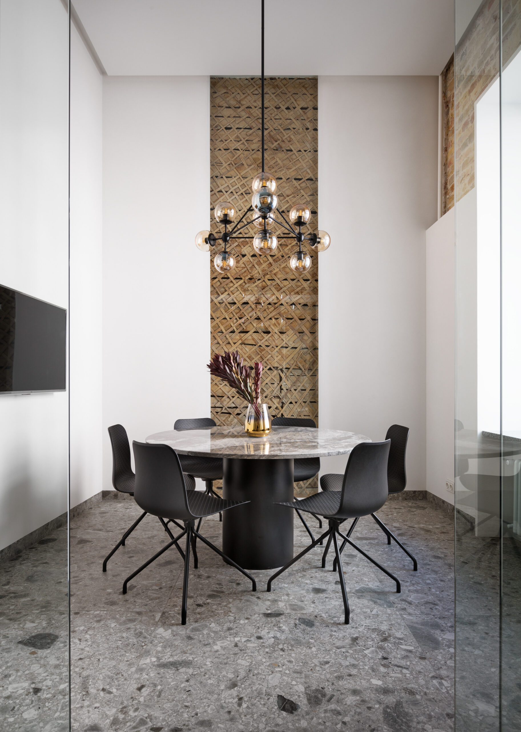 The location peculiarities serve as a milestone of the project concept. Thus the key task was to preserve the existing authentic brickwork together with other original architectural elements such as the wooden grid in the meeting room.