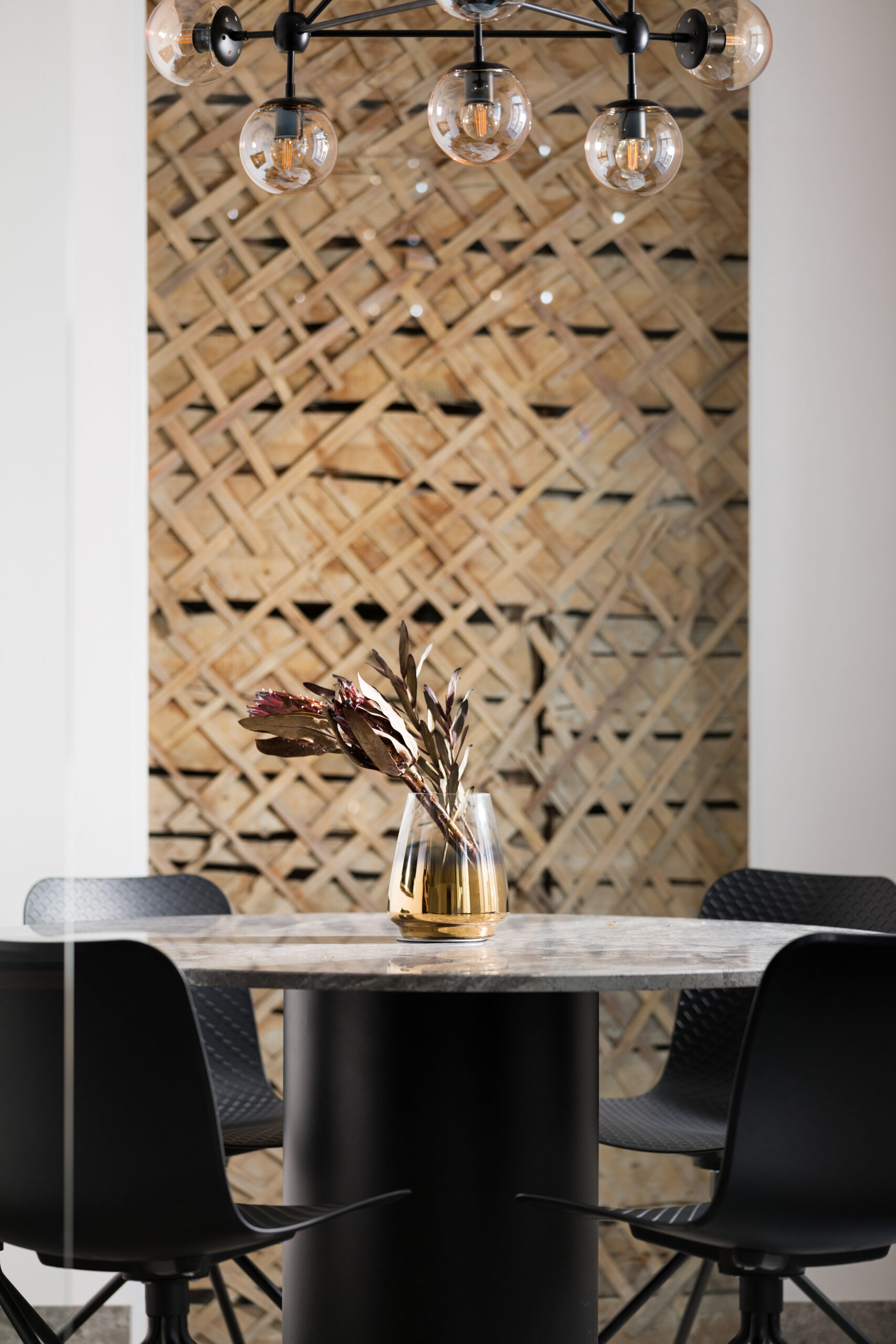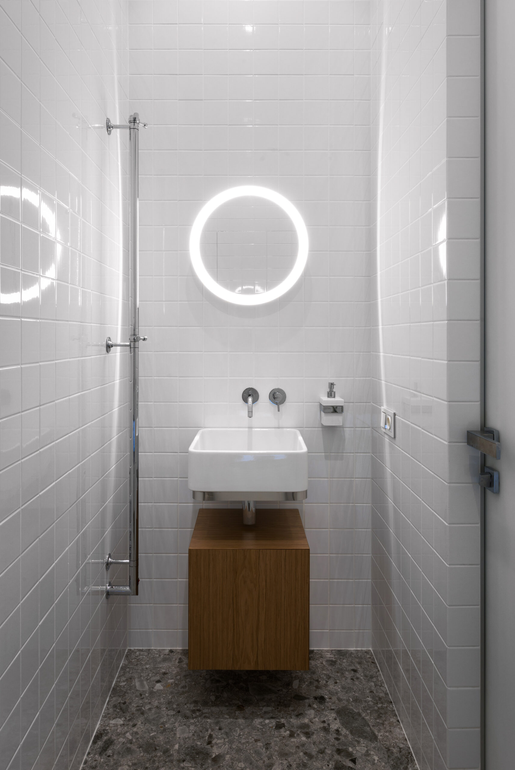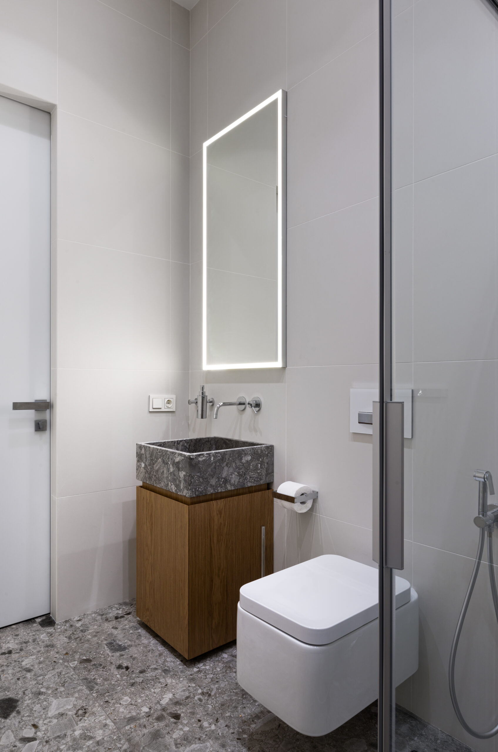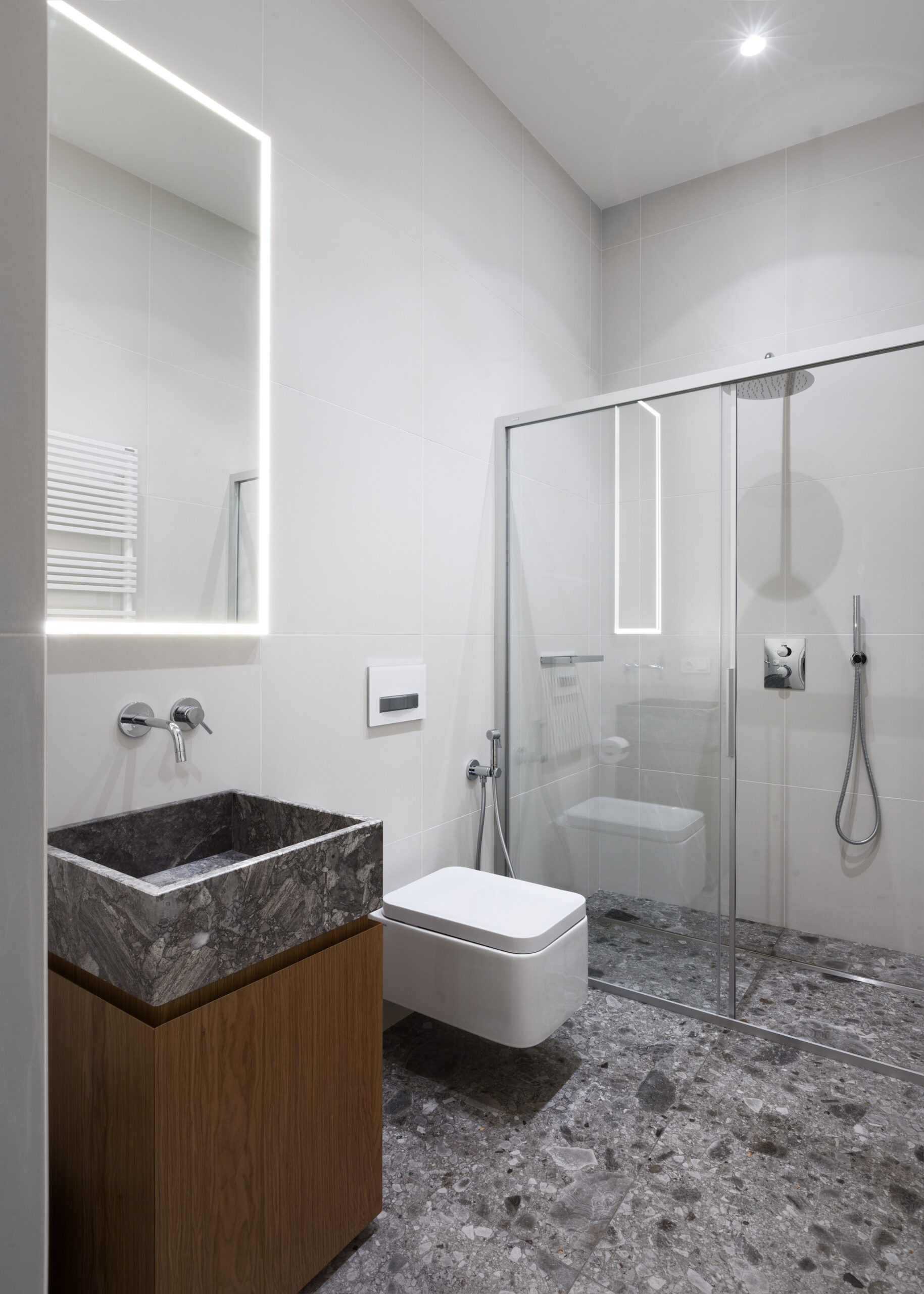 Only natural materials are used in this project. They are marble, wood, ceramic tiles, glass.