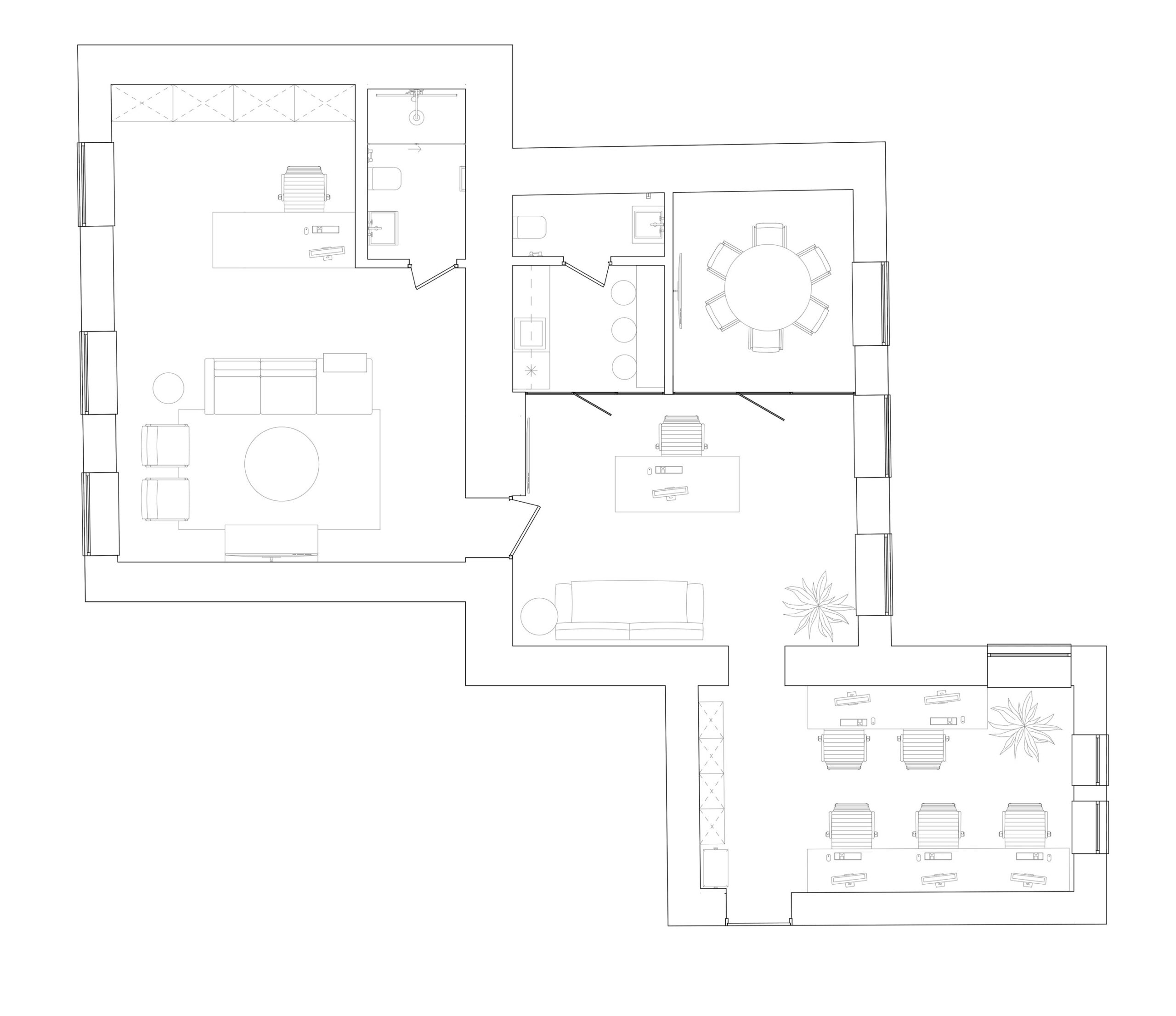 The office typology is enriched and diverse by containing the multipurpose functional zones and diverse by containing the multipurpose functional zones and spaces combined in the most convenient way. Among the others, there are anteroom adjacent to the working area, reception, meeting room and the chief cabinet supplied with the bathroom.